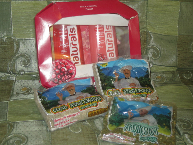 набор с шампунем и гелем для душа))) с обалденным запахом, 2 пакета соли адыгейской и сухая смесь пряностей!!! а запах!!!! девочки это надо нюхать