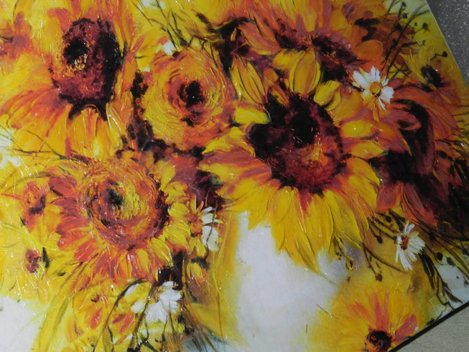 Я уже свою подарила нашей любимой воспитательнице в садике. И угадали с подсолнухами, потому что она их коллекционирует, как оказалось! Она подумала, что это нарисовано, если бы я не открыла секрет (неудобно было как-то обманывать)))))).