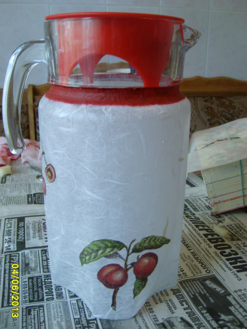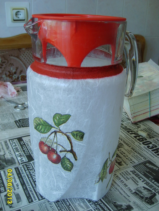 Вот такой кувшин делаю, кант поверху и понизу такой же планирую. Но вот верхний нанесла и засомневалась - цвет канта подбирала под цвет вишенок, темно красный, а теперь думаю может все-таки сделать более светлым, под цвет крышки? Как думаете?