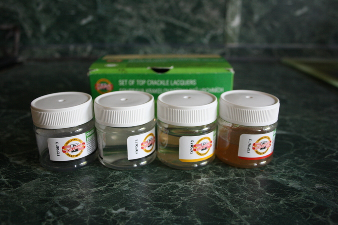 Ну, нету возможности в нашем малюсеньком городке купить достойные лаки. В первый раз трещинки получались удачные, но лак быстро вышел из строя, загустел. Купила вторую упаковку. Она, вероятно неправильно хранилась и, хотя лак был не загустевший, трещинки очень медленно появлялись и были не ярко выраженными.