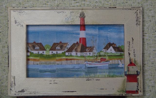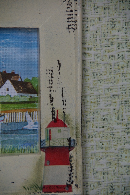 Рамку загрунтовала, задекорировала в стиле шеби. покрыла лаком 2 р. + приклеила маячки и тени подрисовала и травку, лаком покрала в неск. слоев.