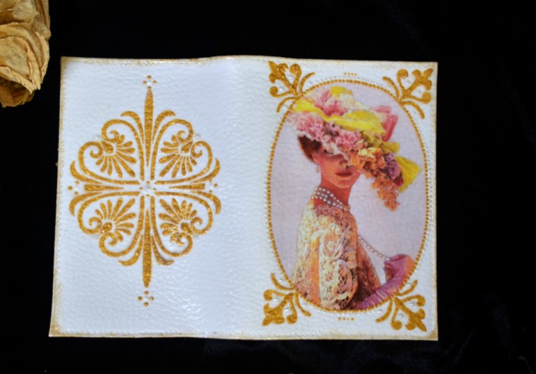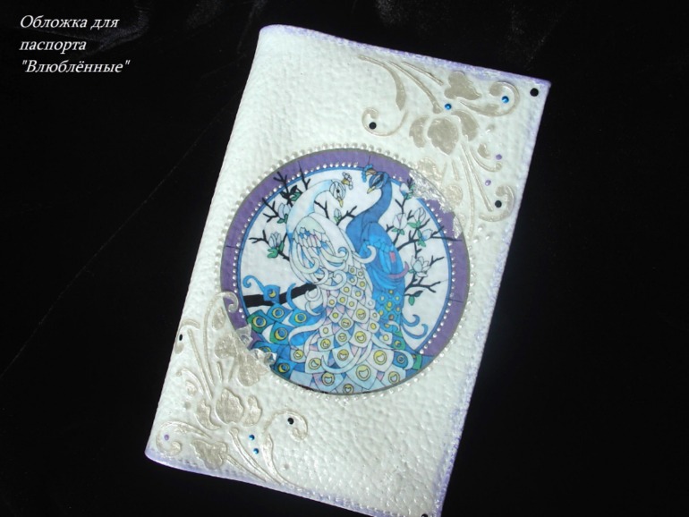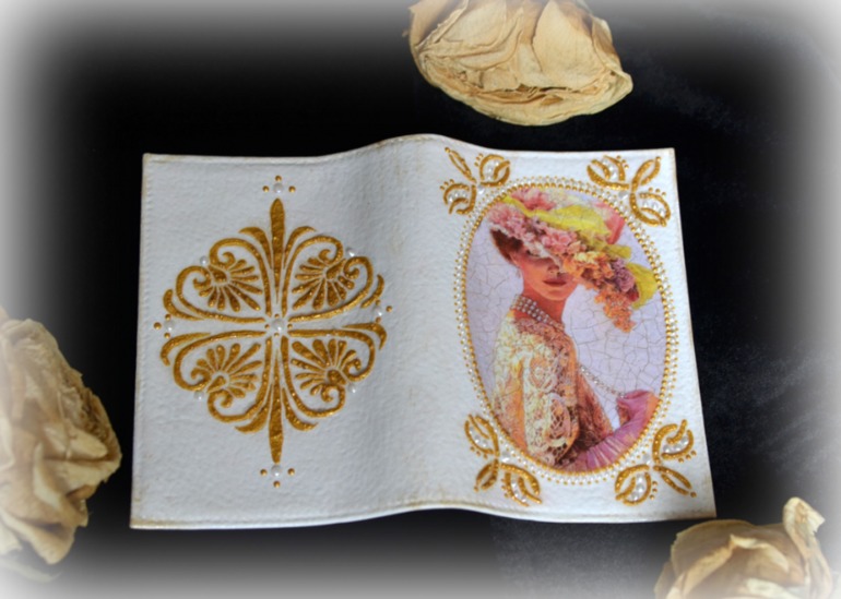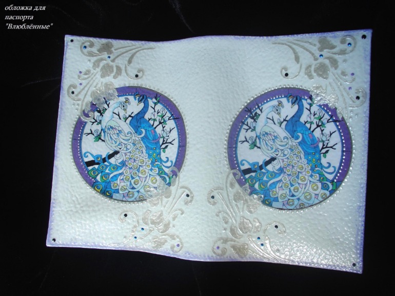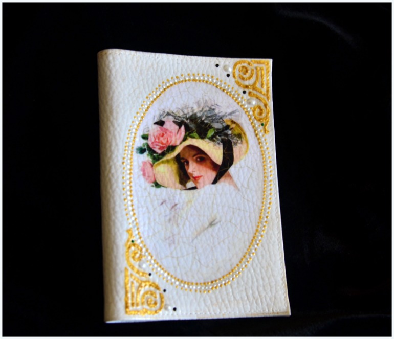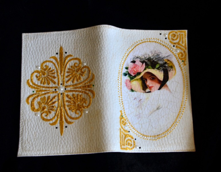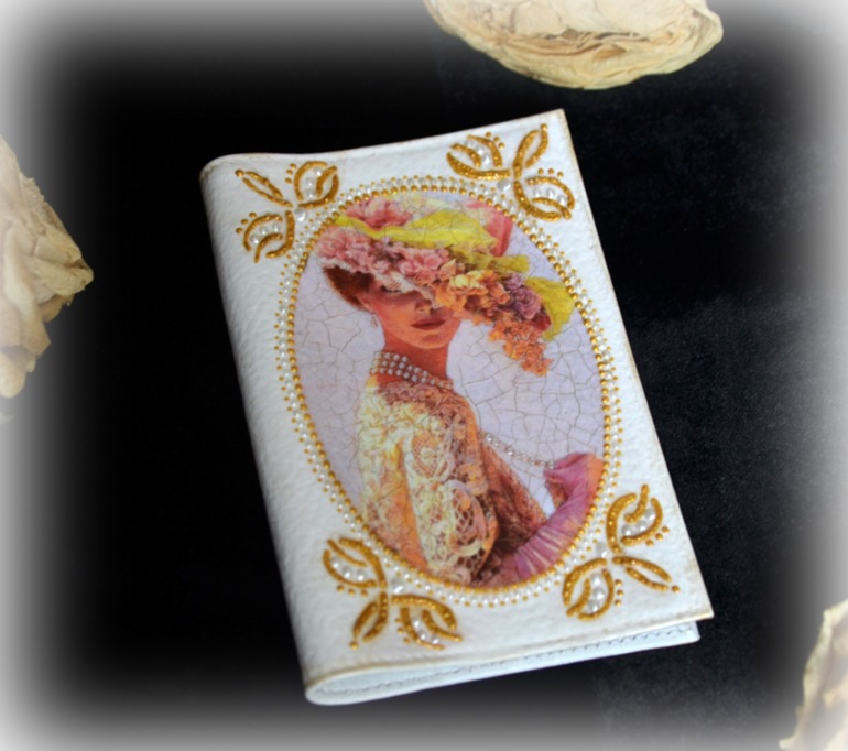 кожаную обложку обезжирила ацетоном, нанесла грунт Сонет в 2а слоя, наклеила клеем для ткани лаковые распечатки, нанесла через трафарет моделирующий крем viva dekor, затонировала углы краской в тон мотиву, лак стекловидный 3 слоя, контуры и перелен пен в тон мотива