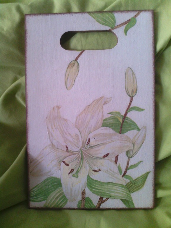 1. Доску зашкурила, загрунтовала, покрыла 2 слоями белой акриловой краски с промежуточной просушкой. Зашкурила нулевкой для гладкости.