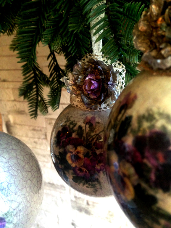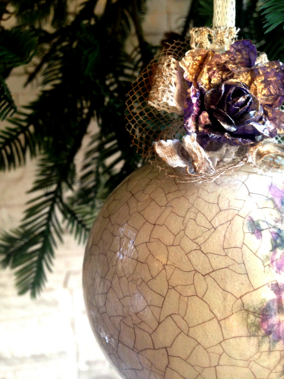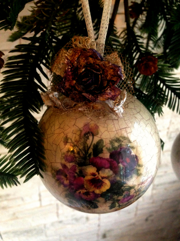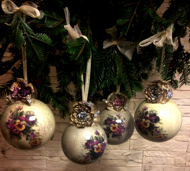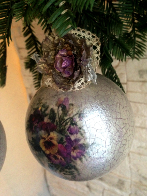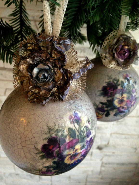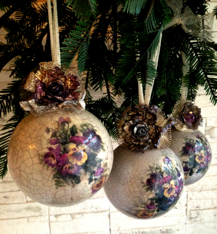 Ход работы: шары зашкурила, обезжирила, прогрунтовала, приклеила фрагменты декупажной карты, сделав надрезы (сразу вспомнила урок тарелочку:))) лак, шкурка и так много раз, подрисовка, лак, кракелюр двушаговый 753-754, затерла трещины пастелью, смыла потом лак глянцевый, и финишный слой стекловидный лак.