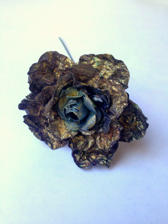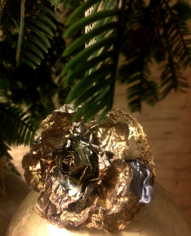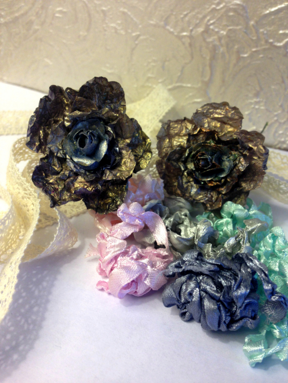 Потом из кальки и какой то упаковочной бумаги из коробки с обувью сделала цветочки,покрасила бумагу косметическим пигментом, все залачила лаком для волос, дальше сделала шебби ленточки, кружево,горячий пистолет, всякие тряпочки, кусочки и все они готовы...шарики:)