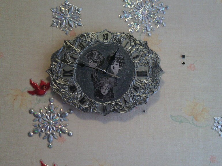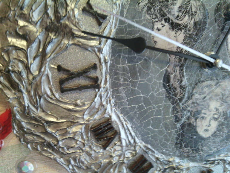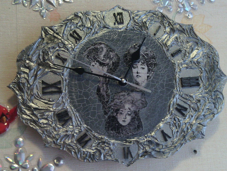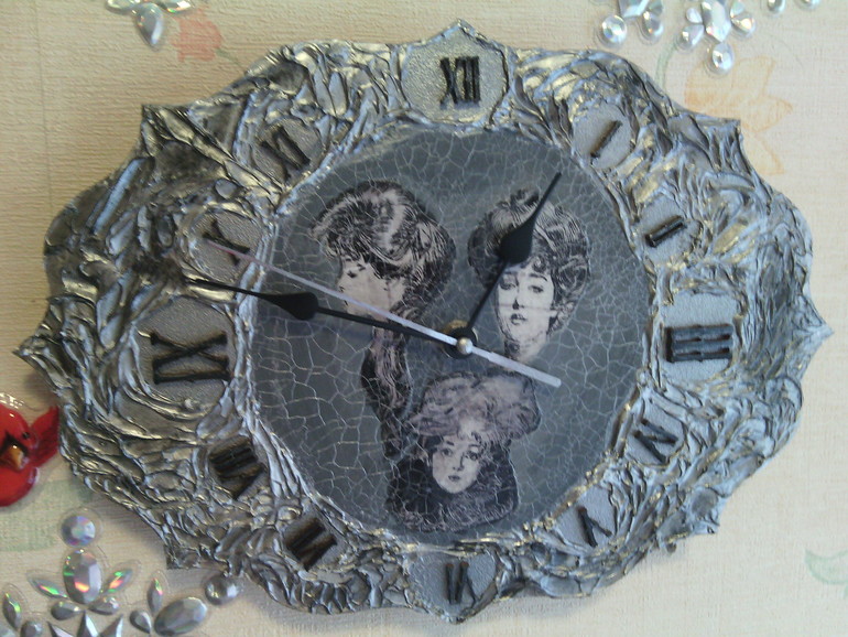 Всё бы ничего, но вот есть одно НО. И это, наверное, одно из первых правил, что запомнили мы, участь в школе у Натальи Шихаревой: не должно быть отдельных "летающих" частей тела. Я никогда не забуду работу одной из девочек с ранних потоков, где у неё были в глубокой тарелке при обратном декупаже головы котиков... Вот сразу они вспоминаются.Мне ОЧЕНЬ далеко до идеальных работ, иногда и до хороших далеко.Это я пишу не для того, чтобы обидеть, а для того, чтобы дальше Ваши работы становились не только краше, но и воспринимались адекватно. Я, например, не вижу уже ничего, кроме "отдельных" голов.Возможно, если бы там была одна дама, выглядело бы это совсем по-другому. А вообще часы выглядят очень необычно, как литые. Кракелюр просто прекрасный!!!