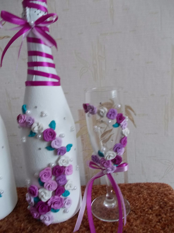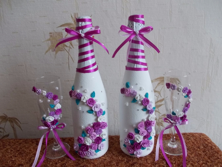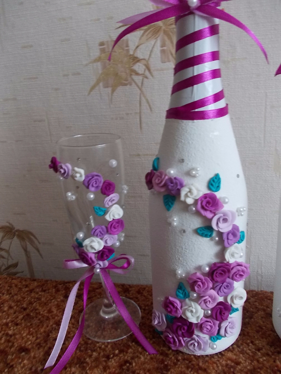 сделать им свадебные бутылки и бокалы.Вот что из этого получилось.Материал: грунт Сонет, белая акриловая краска, полимерная глина, атласные ленты, бусины 2 размеров, немного страз.
