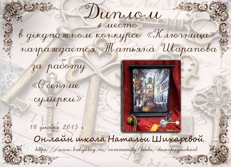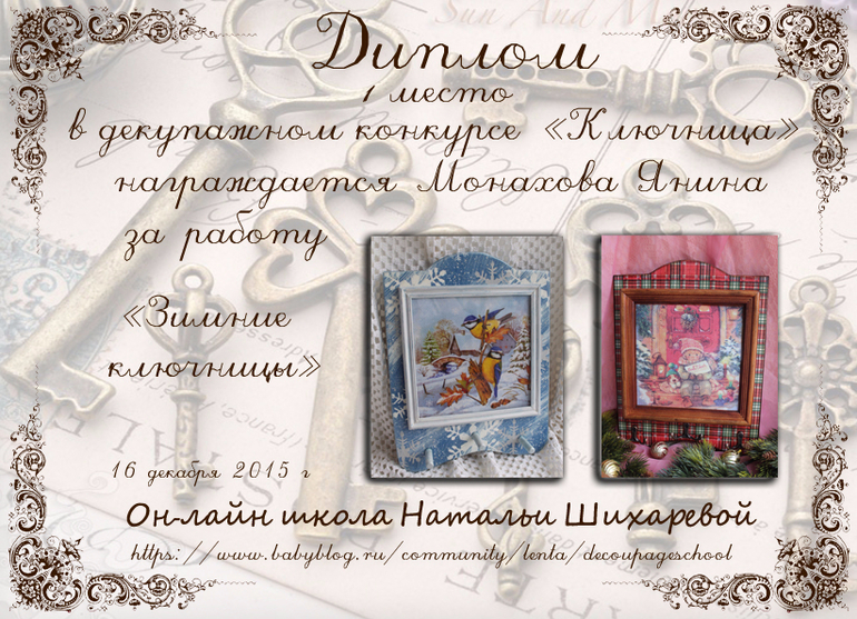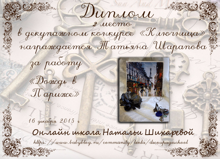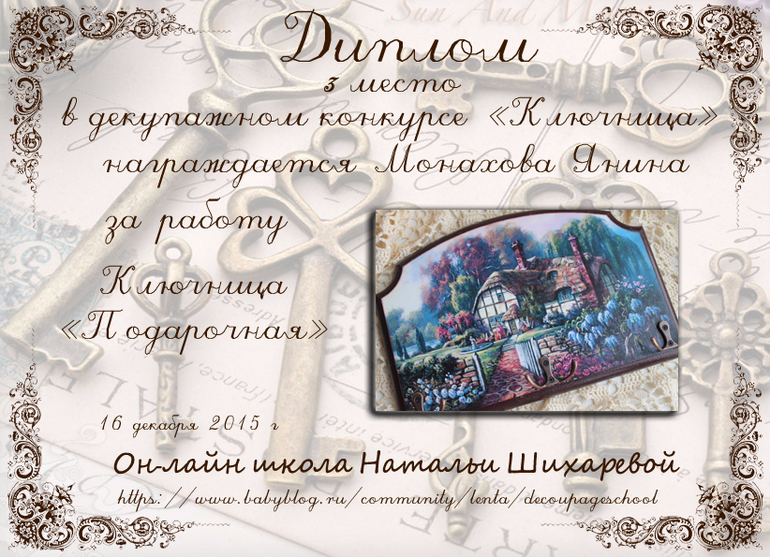 Виктория в ОН-ЛАЙН ШКОЛА ДЕКУПАЖА НАТАЛЬИ ШИХАРЕВОЙ 10 лет Дипломы конкурса "Ключница" Конкурсные работы Спасибо Татьяна за дипломы. Посмотрите еще 20 записей на эту тему Отменить Ответить Монахова Янина 18.12.2015 Ответить Татьяна Шарапова Спасибо ОГРОМНОЕ за такие славные дипломы! В коллекцию!!! 17.12.2015 Ответить Deльt@ ой какие красивучие))) 16.12.2015 Ответить КОНКУРС "КЛЮЧНИЦА"!!! Чаты Беременных Выберите чат: Январята-2026 Февралята-2026 Мартята-2026 Апрелята-2026 Майчата-2026 Июнята-2026 Июлята-2026 Августята-2026