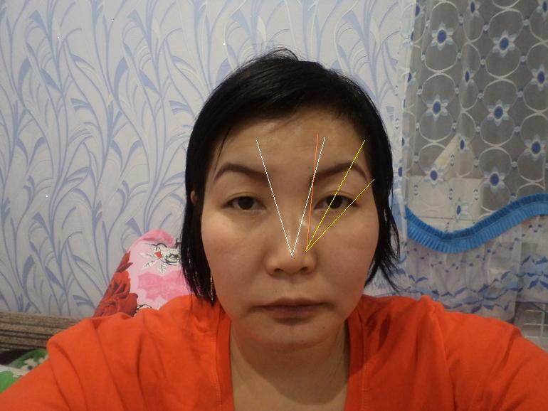 1: начало брови – проводим касательную от крыла носа к внутреннему уголку глаза.