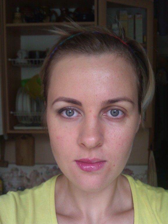Вот что я с утра намазала своей неумелой рукой. Крем ВВ, карандаш для глаз, тени (их же на бровь), корректор под глаз, карандаш для губ, блеск для губ.
