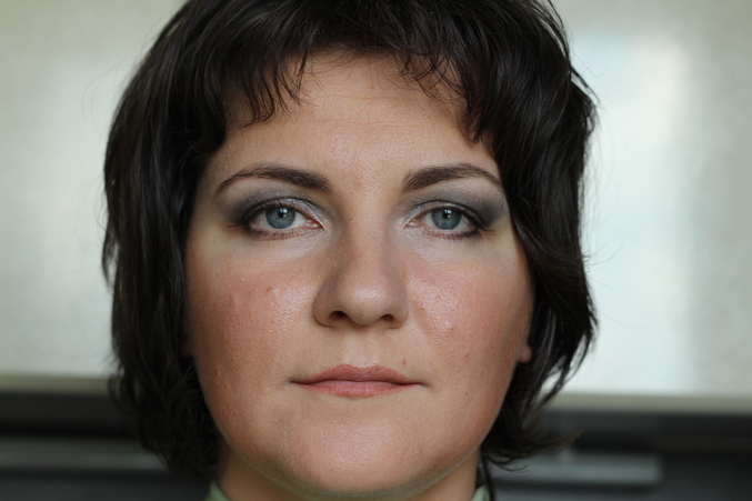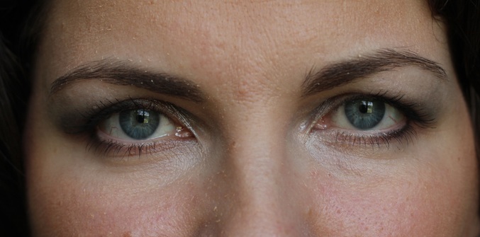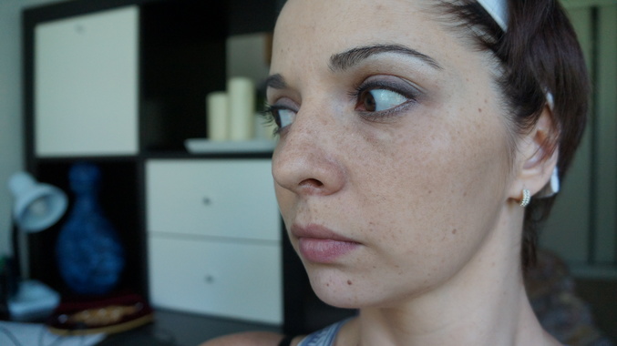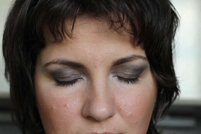Теперь глаза. Глаза - круглые, проблем никаких не вижу. Поэтому руководствовалась видео макияжа для круглых глаз, которое Лекса давала мне ранее. Я считаю, что я - зима, поэтому цвета - белый, серый, графит (палетка для смоки). Есть одна большая проблема - это руки не из того места растущие. Я смотрю все видео и не понимаю как выходят такие рисунки на глазах, у меня получилось вот что, не могу назвать это макияжем глаз.