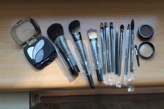 Набор кистей, палетку теней для глаз, и отдельную палетку матовых теней для бровей.