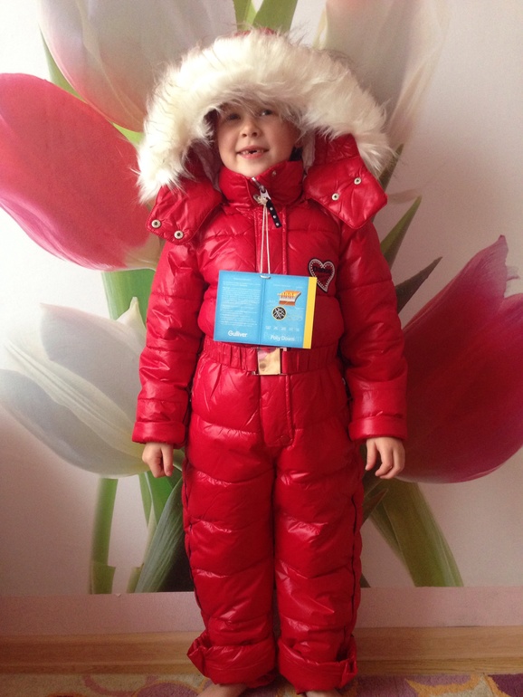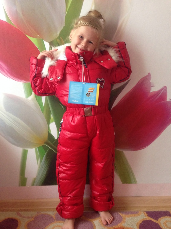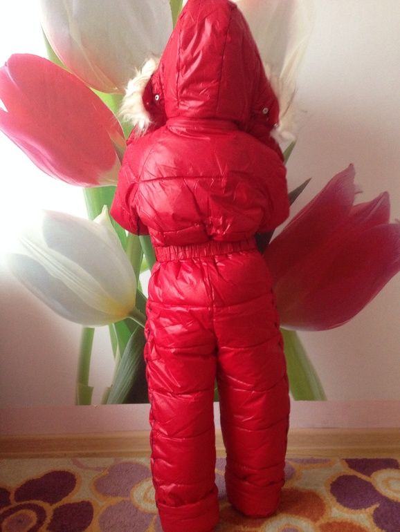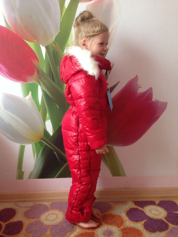 Получили сегодня наш красный зимний комбинезон. Я очень довольна. Брала с рассчетом на 2 года. Размер 122 на дочку ростом 113. Штанины и рукавки подогнули.