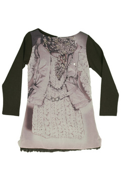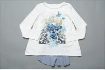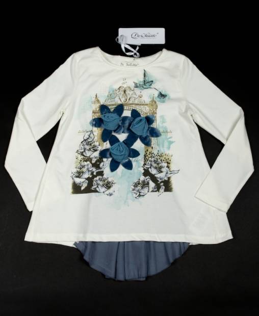 4. Футболка с длинным рукавом спереди декорирована контрастным принтом и текстильными цветами, сзади вертикальной вставкой из легкой плиссированной ткани.