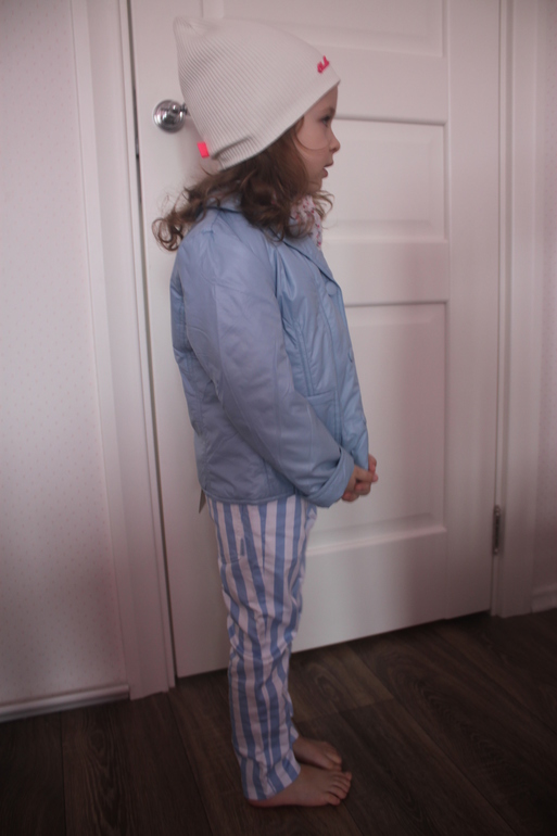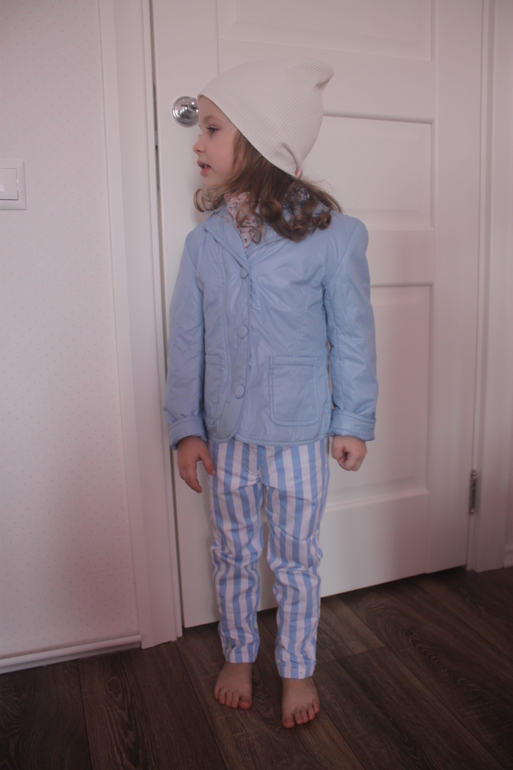 Курточка легкая, невесомая прям. С тонюсеньким слоем синтепона. Застегивается на молнию сначала и сверху кнопки. Нам немного великовата, рукава подогнуты и в объеме небольшой запас. Но мы худышки.