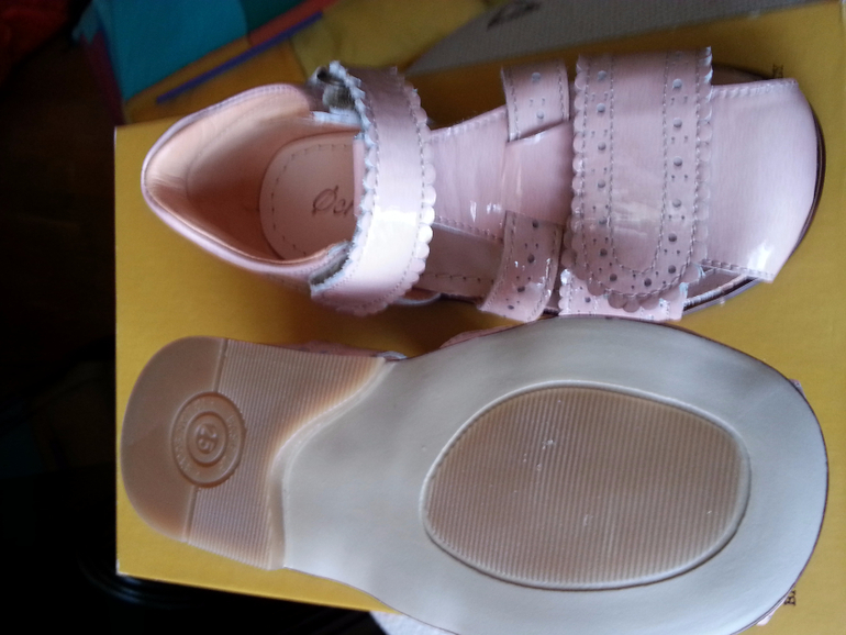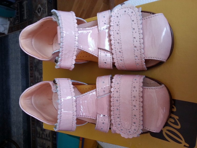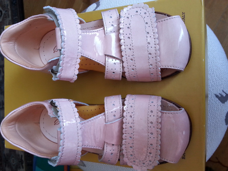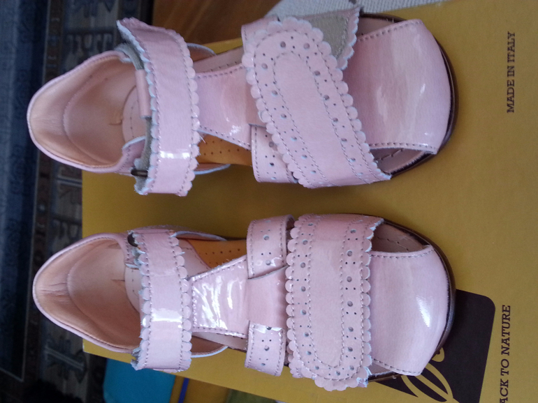 Сандалии для девочки. Материал верха - натуральная лакированная кожа розового цвета. Застежка-липучка. Подошва - натуральная кожа с профилактикой. Высокая пятка с мягкой верхней частью хорошо фиксирует детскую ножку..Очень красивые, со слезами отдаю, переросли. Оригинал, цена 4800 руб.