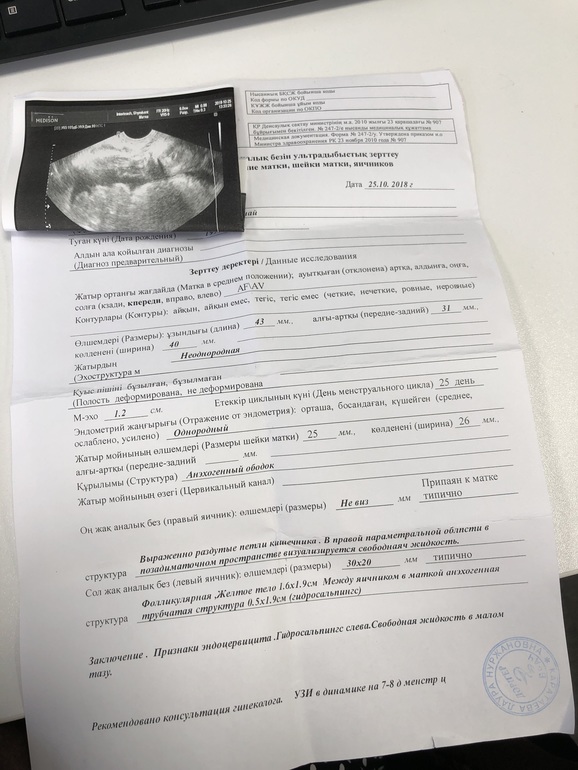 Здравствуйте! Хотела узнать у вас точный ответ, который меня очень тревожит. У меня были 2 кисты правого яичника в 2016 и 2018 году. После мы с Мужем поехали в Ташкент сделали гсг. Во время овули у нас был ПА. Овуляция была 19.10.18 года. 20.10.18 был ПА. Месячные были с 1 по 4 октября. Следующие месячные с 6 по 9 ноября. Сделала узи, заключение :признаки эндоцервицита, гидросальпингс слева, свободная жидкость в малом тазу. (В позадиматочном пространстве). Есть жёлтое тело. Гинеколог сказала что это все может указывать на беременность и сказала потерпеть до месячных и пить фолиевую кислоту. Я очень хочу детей, признаки есть, но стул жидкий. Тест показывает слабую, очень слабую полоску вторую. Вот хочу узнать у вас могу ли я наконец быть беременной? Очень на это надеюсь. Действительно ли эти диагнозы могут обернуться беременностью? Спасибо заранее.