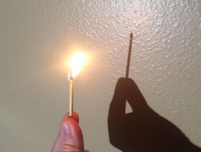 Опыт: Зажгите спичку и поднесите её на расстояние 10-15 сантиметров от стены. Посветите на спичку фонариком - и вы увидите, что на стене отражается только ваша рука и сама спичка. Казалось бы, очевидно, но мы никогда об этом не задумываемся.