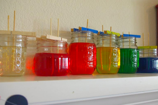 Оставьте палочки на ночь сушиться. Утром в 2 стаканах воды на огне растворите 5 стаканов сахара. Дайте сиропу остыть минут на 15, но не дольше, иначе кристаллы не будут расти. Потом разлейте его по банкам и добавьте разноцветные пищевые красители. Опустите палочки в банку с сиропом так, чтобы они не касались стенок и дна банки (в этом поможет бельевая прищепка).