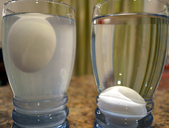 Опыт: Аккуратно поместите яйцо в стакан с простой чистой водой. Как и ожидалось, оно опустится на дно (если нет, возможно, яйцо протухло и не стоит возвращать его в холодильник). Во второй стакан налейте теплой воды и размешайте в ней 4-5 столовых ложек соли. Для чистоты эксперимента можно подождать, пока вода остынет. Потом опустите в воду второе яйцо. Оно будет плавать у поверхности.