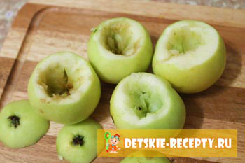 2. У каждого яблочка срезать носик крышечкой так, чтобы ее потом можно было закрыть обратно. Вычистить ложкой сердцевину.