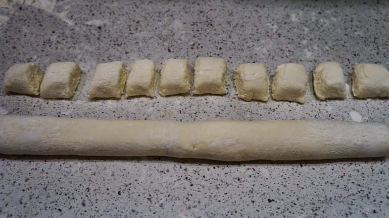 Обваливаю его в этой муке, тесто перестает быть липким и раскатываю его в колбаску, если опять липнет можно опять сверху присыпать мукой. Режу на маленькие кусочки и выкладываю на присыпаную мукой тарелочку.