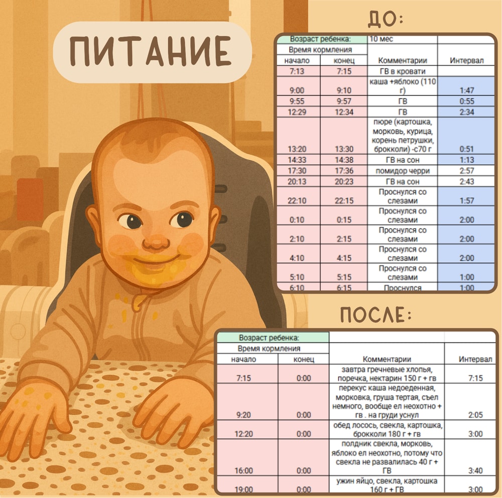 Посмотрите на питание ⬆️⬆️⬆️ Мартина до работы и после. В 10 месяцев он прикладывался к груди постоянно (и днем и ночью), прикорм кушал неохотно, маленькими порциями. Мама никогда не могла понять, когда малыш захочет кушать в следующий раз. Теперь же у него предсказуемый график питания, хороший аппетит и порции соответствующие энергетическому прикорму. Мама готовит еду к определенному времени, а Мартин как к раз во столько и проголодался!