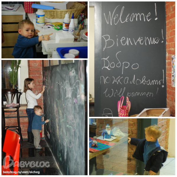 Игра в прятки переросла в игру в салки... Детей было не увести!!! Кстати, не увести оттуда было и Марка (мне кажется, дети очень чувствуют позитивную и благожелательную атмосферу). Марк рисовал на огромной доске мелом, играл в прятки, просил дать ему кисточки...