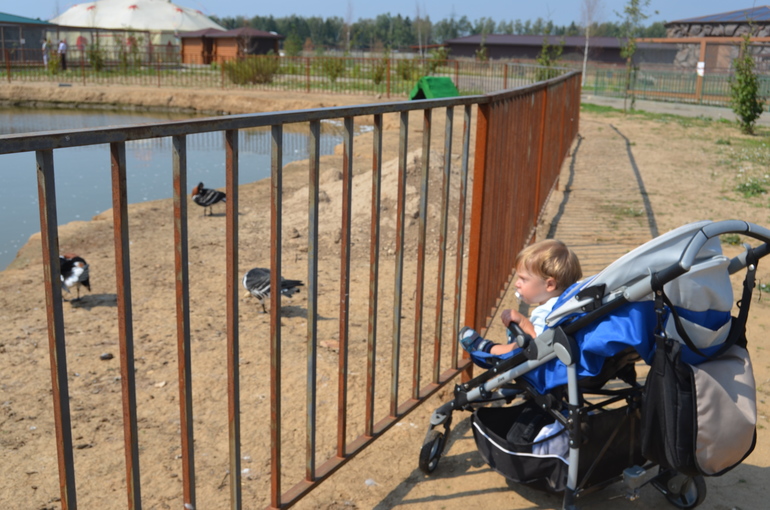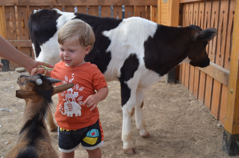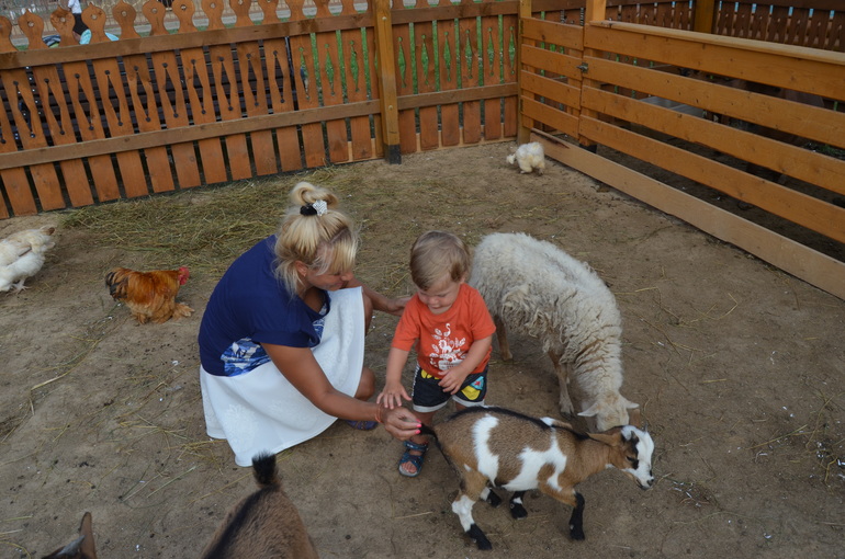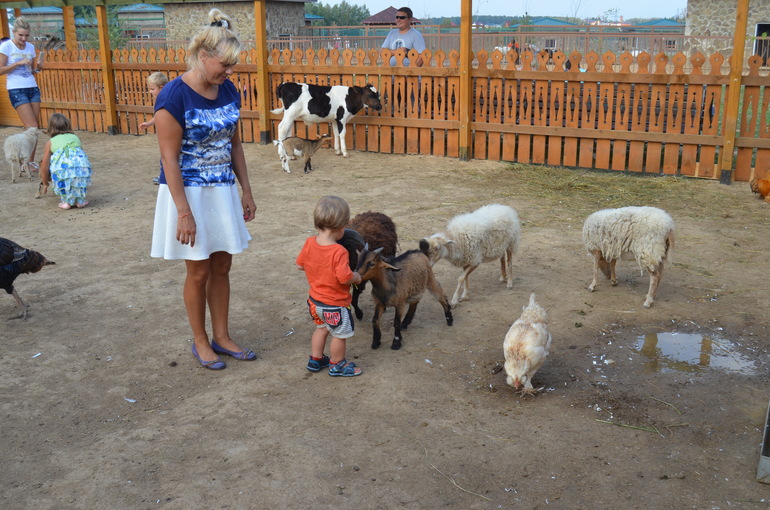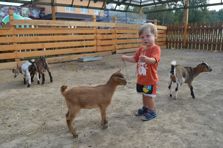 До Антошкиного дневного сна мы посмотрели основную территорию, когда он спал посидели покушали в ресторане, а когда проснулся пошли в контактный зоопарк. (вход 150р. с человека, в стоимость входит корм для животных) Там в основном маленькие козлятки, барашки, телёночек, пони, курочки, петушки.![]()