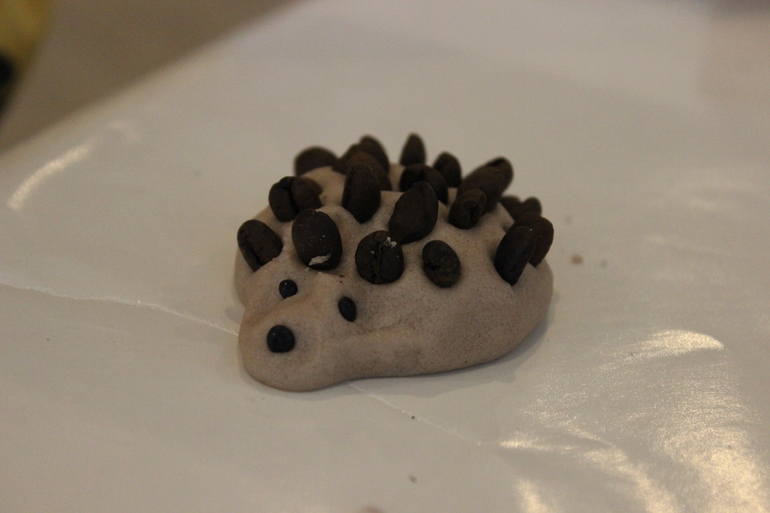 1. Про ежей и мастер-класс. Всё предельно просто: в холле 2 этажа за столом лепим ежа, из соленого теста с ароматом корицы и приделываем ему иголки-кофейные зернышки, Вот что вышло у нашего Львенка: