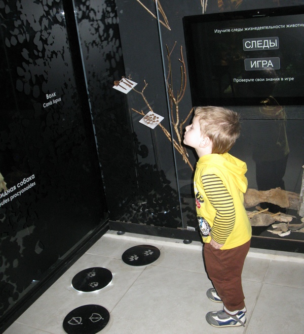 Отдельного внимания удостоился полутёмный уголок в конце зала. За стёклами витрин находятся звери и птицы, но они никак не освещаются. Однако, если наступить на след животного на полу, включается подсветка именно к тому, кто оставил этот след. Мы просто смотрели, кто как наследил, но есть ещё и режим игры, где надо отгадывать и сопоставлять животных и следы самостоятельно.