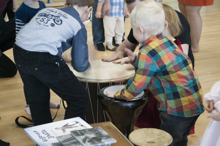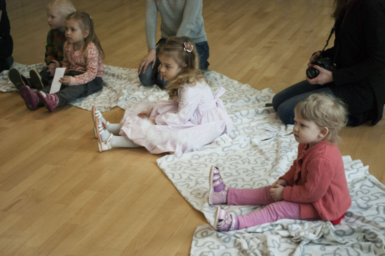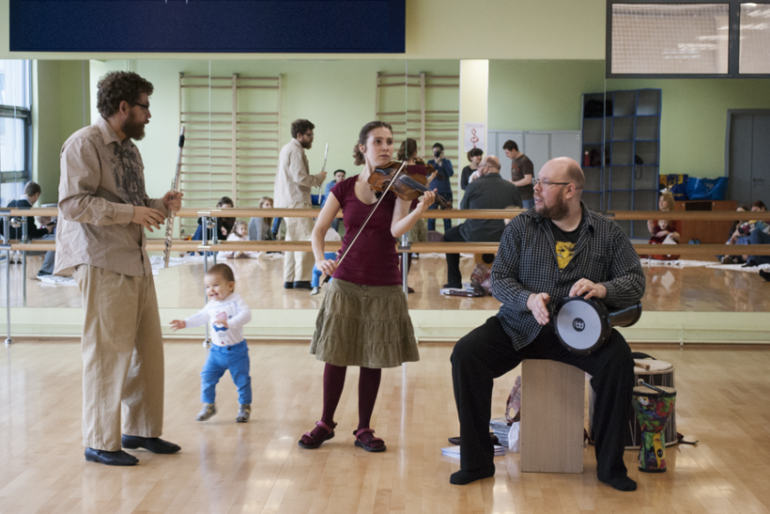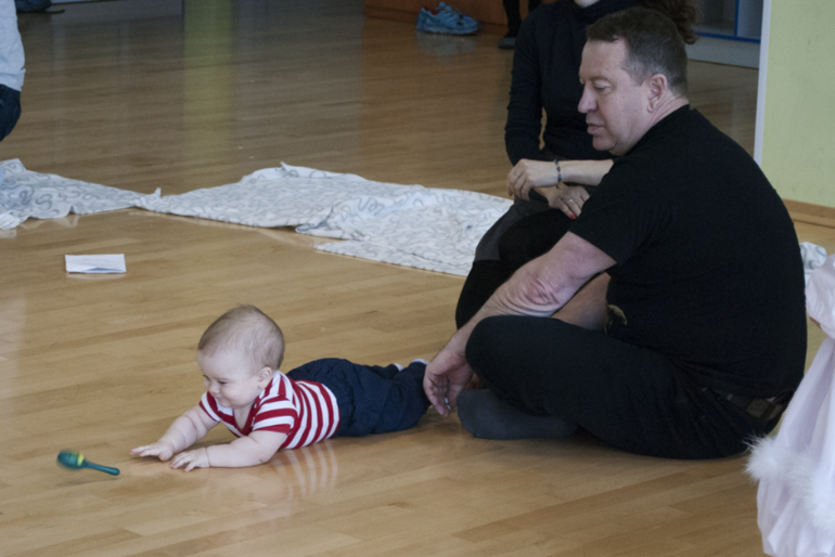 Зал просторный и светлый, взрослые гости разуваются, мы брали сменную обувь, но все-равно разулись, а детки ходят или ползают в носочках или в сменке. Нам повезло попасть на концерт восточной музыки, мы двигались под арабские, турецкие, греческие, еврейские, армянские и другие мелодии. Сначала все сидели и слушали, а наверное мелодии на третьей дети пошли в пляс. Сластена прониклась ближе к пятой, вытанцовывала и задорно хлопала в ладоши после окончания каждой. Были и совсем маленькие детки, которые умеют пока только ползать, но проводят первый год своей жизни под звуки настоящей флейты и скрипки.
