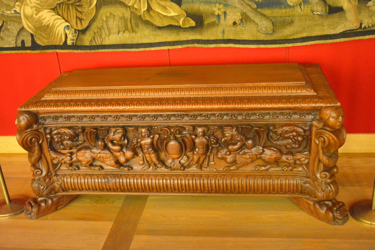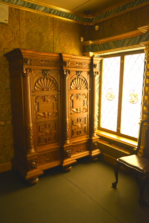 Это фото сделано сидя на лавочке в гардеробе, слева огромный сундук с бахилами. Сотрудники очень оригинально оформили хранилище таких необходимых вещей для пребывания во дворце. Потолки и здесь невероятно красивые, весь дворец поражает обилием росписи.