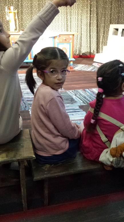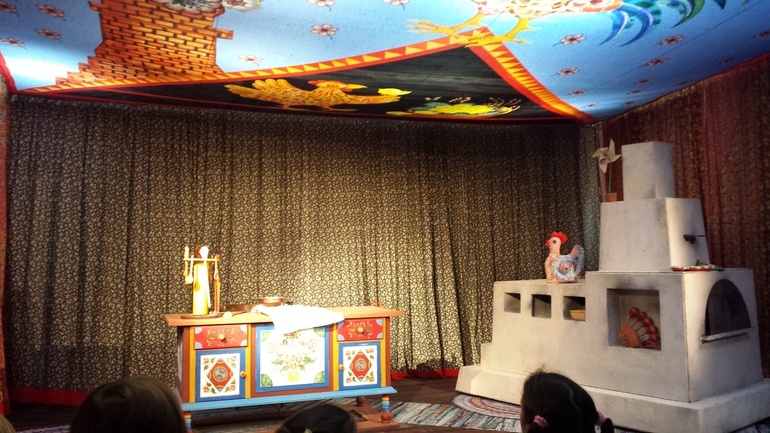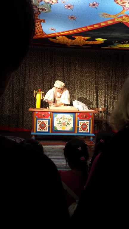 Спектакль проходит в небольшом зале, рассадка свободная, но детей сажают специально на скамейки перед импровизированной сценой, так что всем детям все хорошо видно. А родители сидят позади. Спектакль длится 45 минут, играет всего одна актриса, но как! Без всякого сюсюкания и заигрывания с детьми, хотя постоянно происходит общение с детьми. Настоящая актерская игра. И еще очень хорошее музыкальное сопровождение.