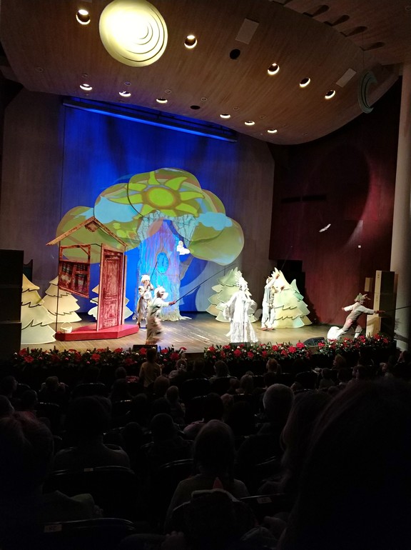 Представление происходило в камерном зале. Не советую брать билет на первые четыре ряда, там нет подъема. Даже на наших местах, если впереди сядет взрослый - ребенку 5 лет не будет видно. Придется посадить на коленки. Подушек для детей в поле зрения не видела.