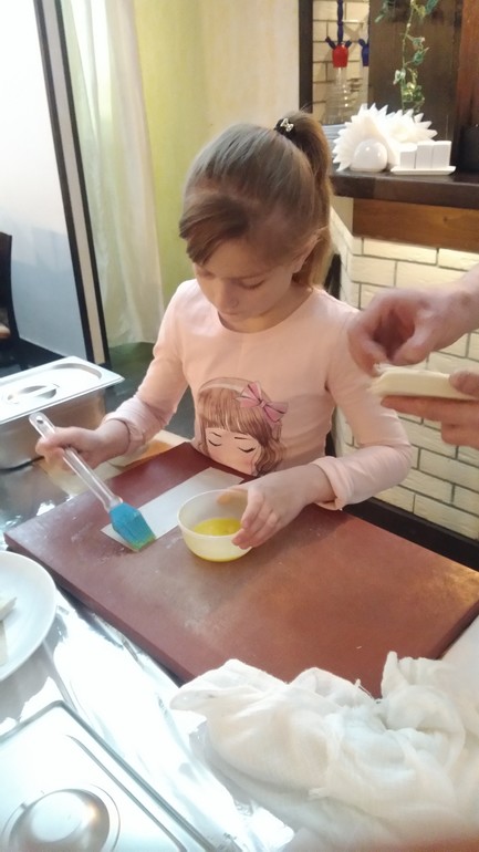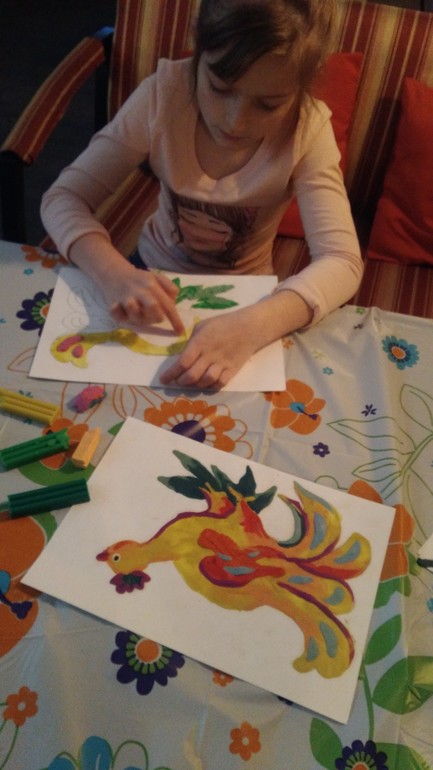 После того,как были сделаны штук 5,блюдо отправилось готовиться. Ученица пошла на творческий мастер-класс по пластилиновой живописи. Она выбрала "ЖАРПТИЦУ".
