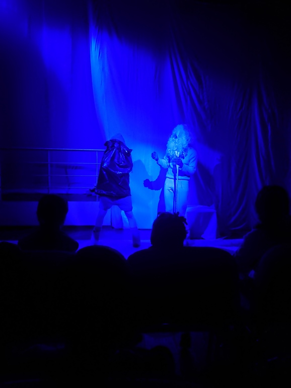 Как видно по фото, спектакль не стандартный))) декораций ноль, один стеб.