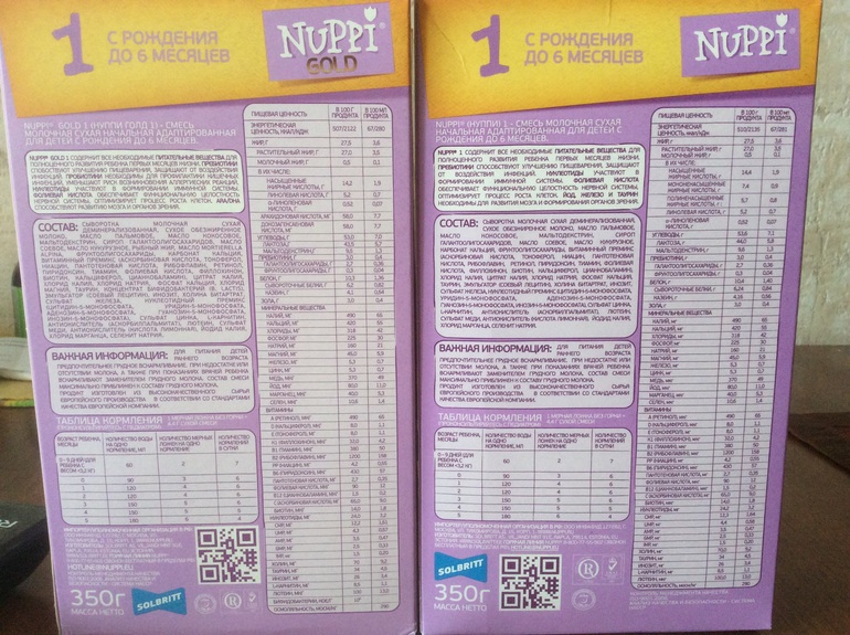 Сравнила состав Нуппи и Нуппи Голд (1). В Нуппи Голд нет мононенасыщенных жирных кислот, меньше белка, углеводов меньше. А в нуппи простом нет арахидоновой и дозоксагеновой кислоты, ну и бифидобактерии соотвественно нет. Остальные все ингредиенты идентичны по составу и количеству.