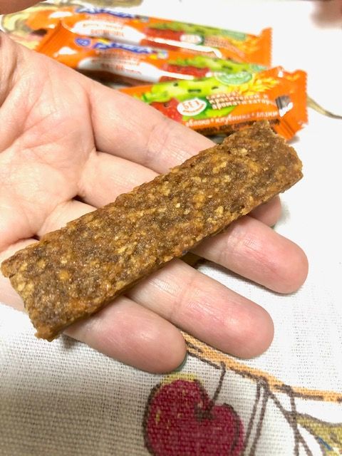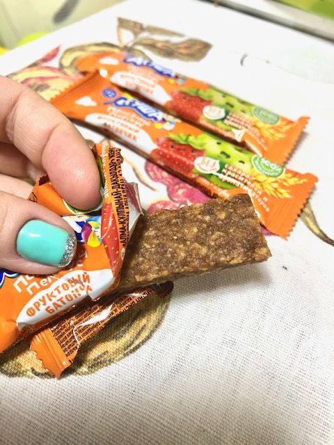 Недавно попробовали батончики Агуша со вкусом клубники, яблока и овсяных хлопьев. Батончик 15 гр, по сравнению, с другими ранее пробовавшими, они по 25 гр и сын их никогда не доедал. Этот он съел за раз, понравился. Хотя и злаки присутствуют, но батончик мягкий и не сухой. Вкус как сладкое яблоко и думаю, можно рассмотреть его как вариант вкусняшки. Замечательно, что подходит для детишек от года, без сахара, достаточно сытный, удобно взять с собой на прогулку. Состав простой и полезный. Цена небольшая, со скидкой вообще отлично.