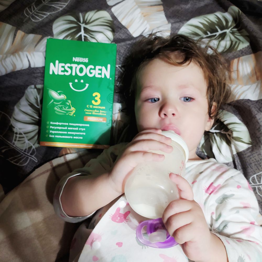 NestogenМы снова вернулись к смеси! К сожалению моя кроха опять перестала ужинать. Всему виной зубки. Если днём хоть как-то кушает, то вечером всего по пару ложек. Решила дополнить рацион детской молочной смесью Nestogen 3. Раньше мы пили уже эту смесь, только 2 номер и ребенку нравилось. В этот раз тоже пьет с удовольствием, а у меня спокойно на сердце, что ребенок сыт и доволен. У смеси отличный состав и, самое главное, никакого пальмового масла, с пребиотиками и лактобактериями! Отлично разводится без комочков!, без неприятного запаха, довольно сытная. Отличный дизайн упаковки, только мне кажется непосредственно пакетик со смесью надо делать с замочком типо ЗИП Лок. Но это мелочи, даже не буду относить это к недостаткам. Главное ребенок довольный! К покупке, естественно, рекомендую!
