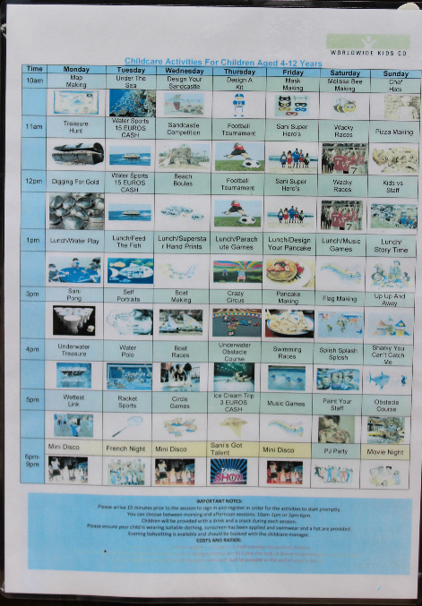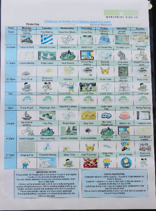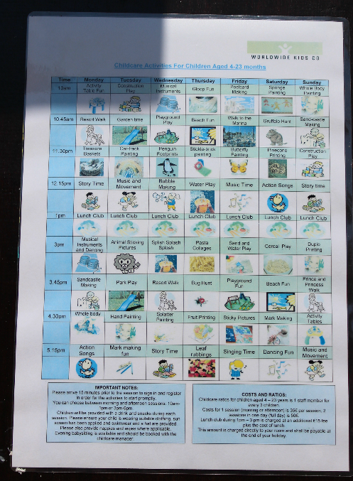 Вот расписание по возрастам (правда это в Сени Бич Отель, у нас мы забыли сфотографировать, но огни не должны отличаться). Как видите в 10 вы можете отдать ребенка, в обед в 13 ч они кормят детей, потом забраете поспать дитё и с 15 до 18 часов ребенок в игровой.