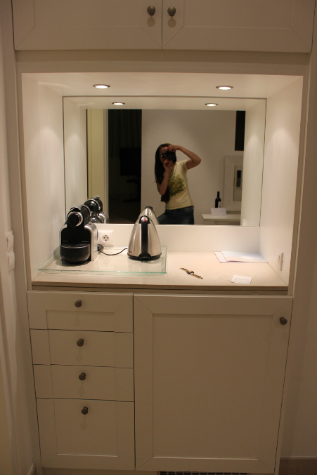 тут мини бар и холодильник (платно), чайник и кофемашина (бесплатный чай, кофе со сливками)