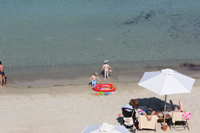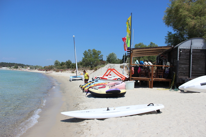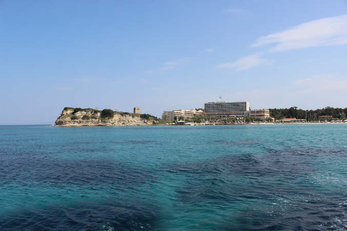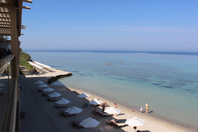 Вид с балкона ресторана на пляж. Если пойти по берегу можно дойти до Sani Marina и всех остальных отелей Sani Resort