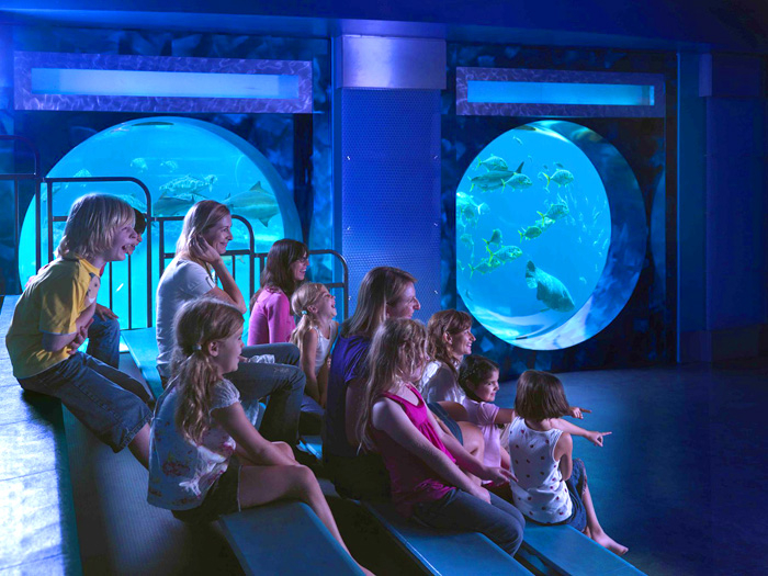 "Подводный театр" -это два окна-иллюминатора подводного театра позволяют детям любоваться подводной жизнью лагуны Амбассадор. В аудитории проводятся развлекательные образовательные программы и игры для детей, а также показывают фильмы на большом экране.