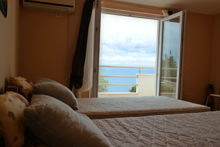 На верхнем этаже спальня с двумя односпальными кроватями - прямо с кровати видно море!