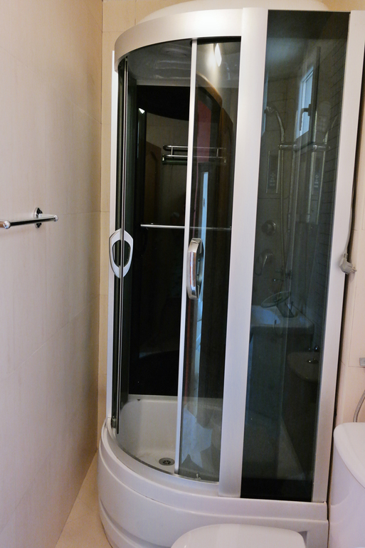 Во второй ванной комнате стоит душевая кабина с гидромассажными функциями, а раковина с оригинальным смесителем.
