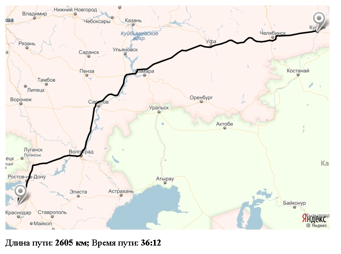 Маршрут проходил через Курганскую обл., Челябинскую обл., Башкортостан, маленький кусочек Татарстана, Оренбургскую обл., Самарскую обл., маленький отрезок Ульяновской обл., Саратовскую обл., Волгоградскую обл., Ростовскую обл., Краснодарский край.