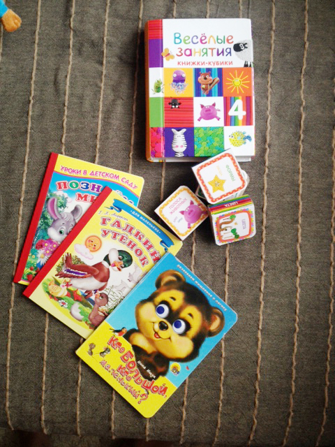 В нашем случае имеем объект, не желающий долго сидеть в кресле без дела, любящий танцевать, слушать музыку, смотреть книжки. Исходя из интересов подготовили к поездке диски с музыкой: просто танцевальной и детскими песенками, со сказками (но это не для нас не подошло, не слушает их пока), специально купила новые игрушки и книжки и не показывала их до поездки, чтобы заинтересовать на более длительный срок, но и старых любимцев тоже, разумеется, взяли.