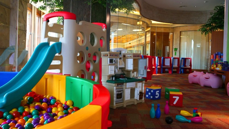 Очень удобно то, что в игровой есть дополнительная комнатка, где устроен детский туалет и есть умывальники для детишек, большой диван, где можно поменять подгузник малышу, покормить его из бутылочки или даже уложить спать (удобно для мам с малышами).