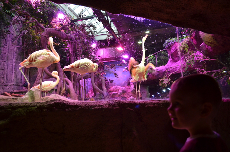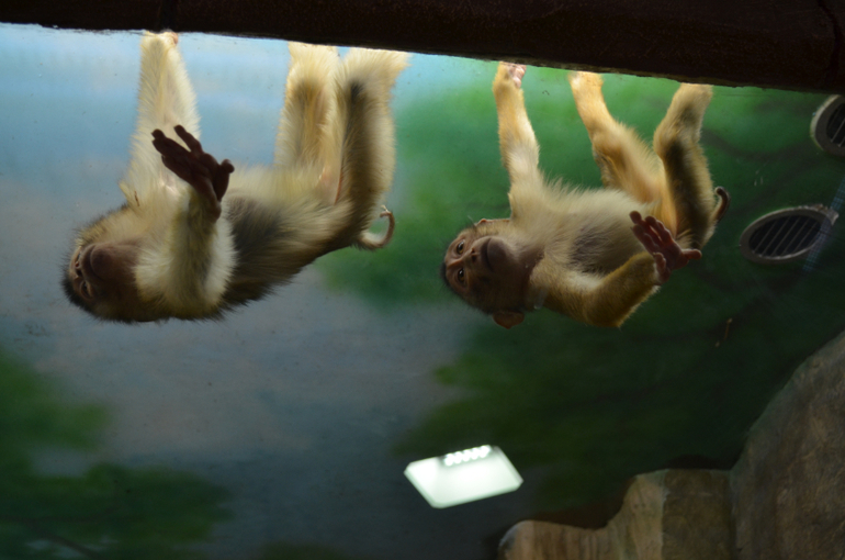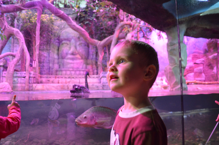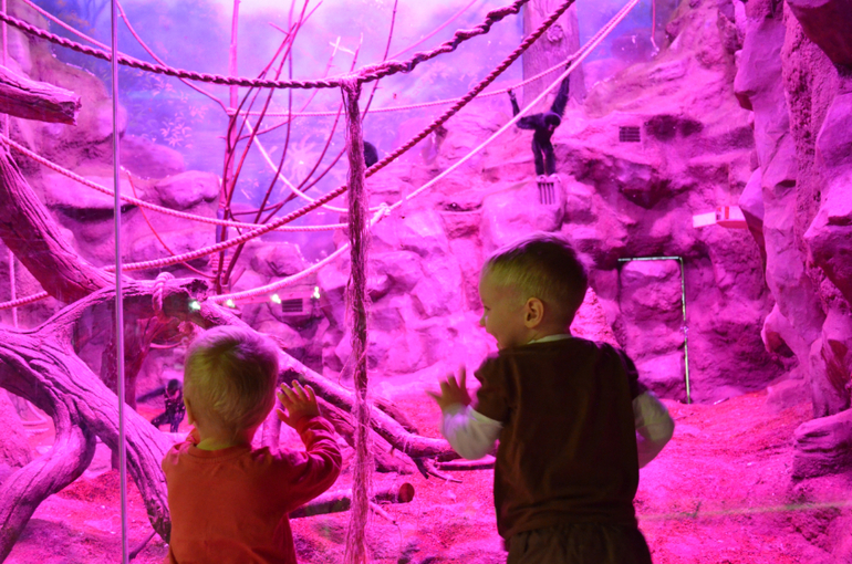 Детям больше всего понравились рыбы, которых можно и в любом гипермаркете в рыбном отделе посмотреть. К обезьянам особенного интереса не проявили, как ни странно. Кажущаяся заинтересованность на фото - результат наших с подругой стараний удержать детей подольше на одном месте и самим посмотреть)). Обезьяны по ту сторону стекла были спокойнее, чем наши две.